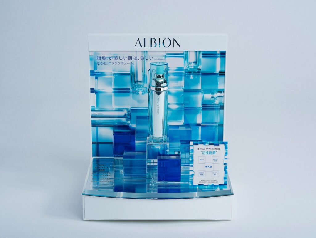 | 特徴 | 春夏のシーズンに向けたテスター展示台。ブルーの配色が特徴のビジュアルイメージよりテスター台と印刷色をリンクして製作。透明のブロック越しに見えるブルーの色から透明感や高級感を出せるテスター台として製作しました。 |